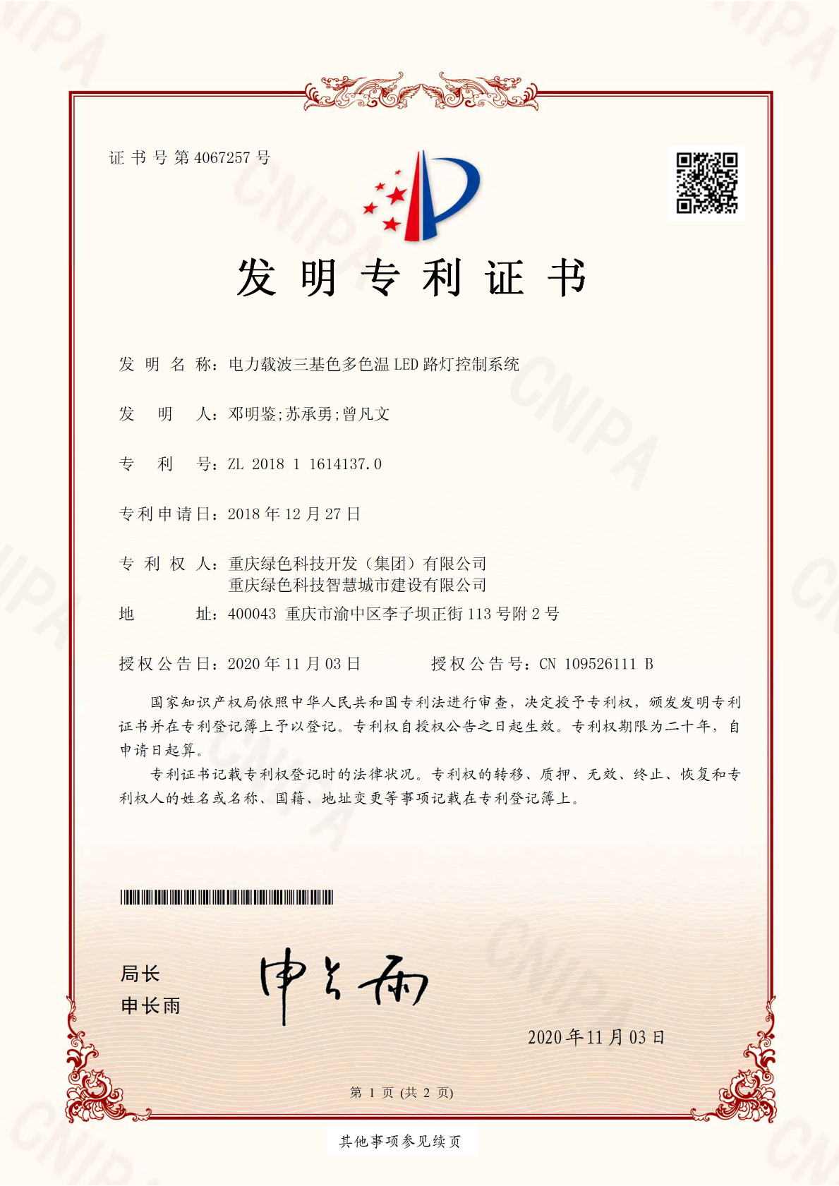 近日,重慶綠色科技開(kāi)發(fā)(集團)有限公司再度喜獲一項國家發(fā)明專(zhuān)利《電力載波三基色多色溫LED路燈控制系統》(專(zhuān)利號:ZL 2018 1 1614137.0)。