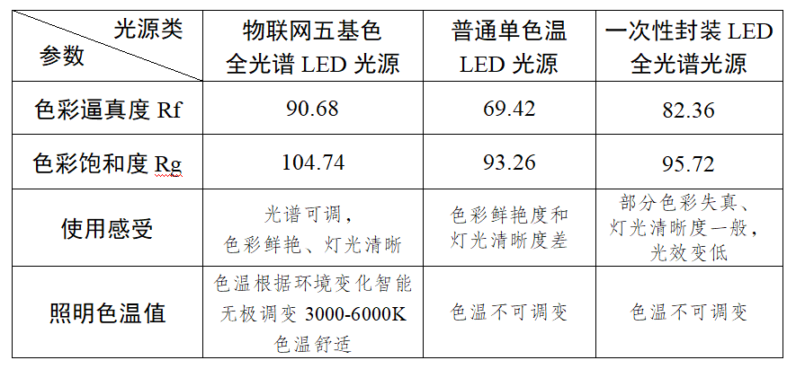 圖2 物聯(lián)網(wǎng)五基色全光譜多色溫LED光源與普通單色溫LED光源、一次性封裝LED全光譜光源參數對比